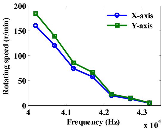 According to Equation (33), the electromagnetic waves of No. 1 and No. 3 stators (S1 and S3) are driven in the forward direction, and that of No. 2 stator (S2) is reversely driven to obtain the rotation speed of the motor at different voltage excitation frequencies, as shown in Figure 17. As can be seen from Figure 17, the maximum speed of motor is about 40.2 kHz, which is the approximate resonant frequency of a piezoelectric stator. It can be known from the experimental results that the speed of the motor decreases as the frequency increases, so the speed can be adjusted by changing the voltage excitation frequency.