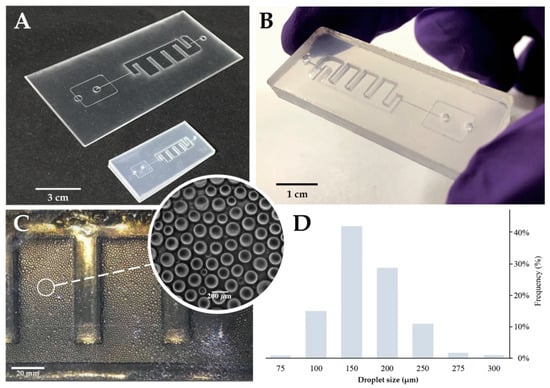 Chip-based microfluidic systems have played an important role in droplet generation technology for biological, biomedical, and diagnostic applications [,,,]. Droplet-based microfluidics uses microchannels and immiscible fluids to generate discrete fractions of aqueous solutions. One of the most widely used geometries is the flow-focusing [,], in which the dispersed phase is symmetrically sheared by the continuous phase in the cross-junction [,]. This architecture yields highly monodisperse droplets [,] that can be used in a diverse range of applications []. Devices exploiting this microchannel geometry are also commercially available (e.g., Bio-Rad QX200, Stilla Naica, Raindance Raindrop Plus). Nevertheless, these devices are costly and, for screening more than one target at a time, require multiple apparatus that are not easily integrable. Additionally, the requirement for specific proprietary materials and reagents have been limiting the adoption of this technology into a larger scale.