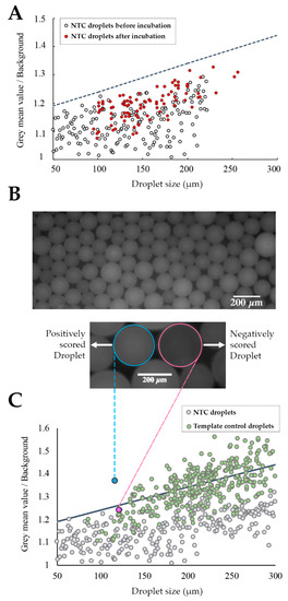 For this, a threshold line was set to allow scoring the positive from negative droplets based on their fluorescence amplitude. Positive droplets inherently exhibit higher fluorescence than negative droplets due to the presence of Evagreen, a dsDNA binding dye in the amplification reaction. However, the fluorescence amplitude of Evagreen fluctuates depending on the droplet size, amplicon size, amplification efficiency, and primer-dimer formation []. Furthermore, larger droplets show an increased probability of encompassing more Evagreen molecules, yielding higher basal fluorescence []. Therefore, to define the threshold for droplet scoring, several reactions without template molecules were assessed (Figure 3A). Data showed a clear correlation between the fluorescence and droplet size, indicating that the threshold line must have a two-dimensional equation with a positive slope value [].
