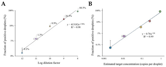 where ECpos gives the fraction of positive droplets corrected to Poisson’s statistics; Nneg is the number of negative droplets; N the total number of droplets; and Pr(0) is the Poisson’s probability of a droplet containing zero target molecules for each target concentration (see Figure D1).