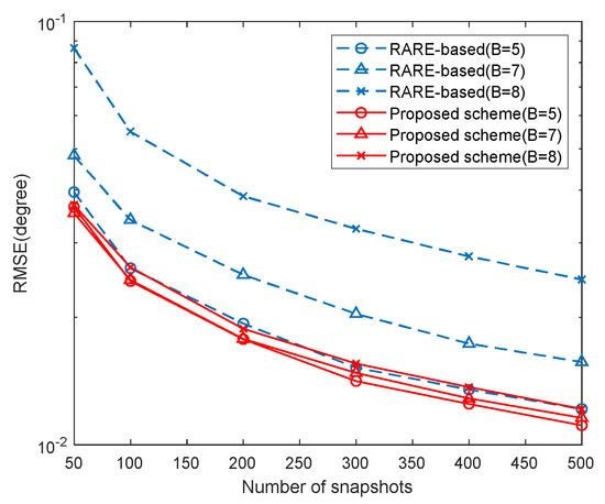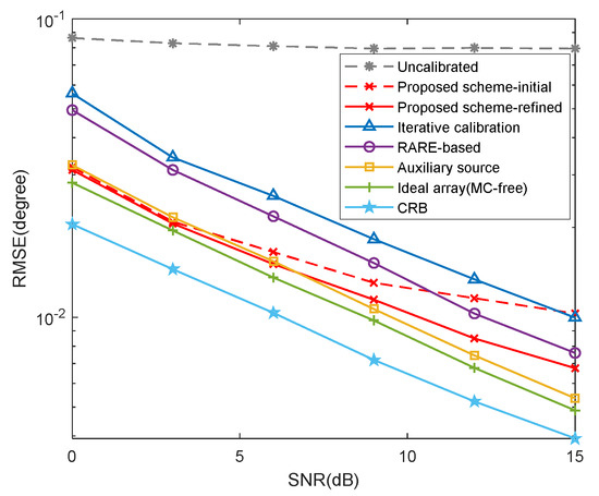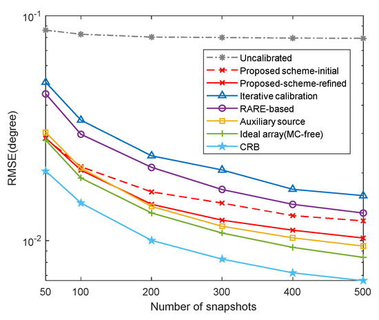 - The proposed scheme can significantly alleviate the mutual coupling by exploiting the structural characteristics of CLA. In particular, it outperforms the RARE-based and iterative calibration methods in parameter estimation, which is illustrated in Section 5.