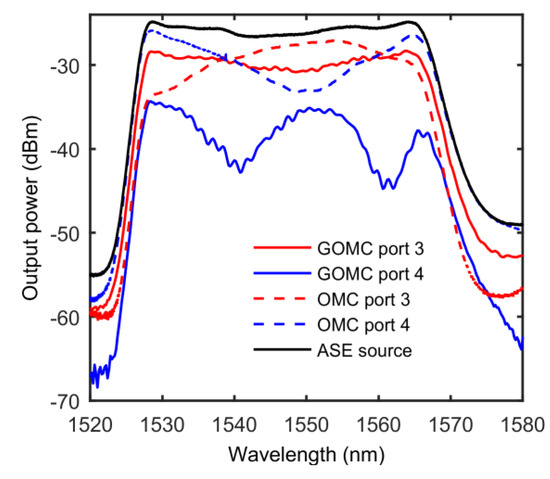During the experiment, we connected the ASE directly to the GOMC to test the intrinsic spectral transmission characteristics of the device. The test results of the GOMC spectral transmission characteristics are shown in Figure 4, in which the red solid line and the dotted line are the characteristic spectra from the P3 and P4 port outputs, respectively. Comparing Figure 2 and Figure 4, it can be seen that the characteristic spectra of the GOMC and the OMC were completely different, and neither met the conjugate symmetry nor regular periodic oscillation conditions. This shows that under the action of graphene and the glass slide, the mode transmission characteristics of the OMC waist region could not be considered two-mode interference. Moreover, during the OMC sample preparation, the twisting and tapering may have caused tolerances in the spacing of the two coupled microfibers, resulting in different coupling coefficients for the through port and the coupled port. However, from previous experience, the geometric asymmetry of the GOMC and the natural absorption of graphene were the main factors leading to the non-conjugation of the characteristic spectrum of the device.