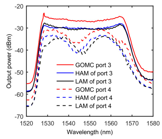 In addition, the ASE power input at the experiment was fixed at 10 mW. By adjusting the PC to inject two different polarization states (herein referred to as the low-absorption-loss mode (LAM) and the high-absorption-loss mode (HAM)) into the GOMC, the characteristic spectrum of the device was significantly shifted (i.e., red-shifted, the spectrum shift was due to the change of polarization state). When the GOMC was injected into the LAM and the HAM, the output intensity difference of the device was about 5 dB at 1550 nm, which was attributable to the broken symmetry of the GOMC geometry and the absorption of the graphene. It can be seen that the GOMC was very sensitive to the polarization and became a typical polarization-dependent device. In view of this, if the GOMC were to be combined with a PC, the tunable filtering function could be conveniently developed.