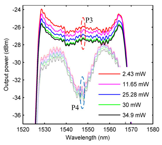 In order to further understand the temperature control characteristics of the device, the all-optical modulation method was employed to test and analyze the device. The internal light absorption heating effect was using to regulate the spectral transmission characteristics of the GOMC [6,7,8]. First, using the experimental system shown in Figure 3, different intensity "DC" 980-nm continuous pump light was injected into the device to test the "static" all-optical modulation characteristics of the polarization-dependent GOMC platform. During the experiment, the power of the ASE probe light injection device (10 mW) and the polarization control state of the PC were kept unchanged. The test results are shown in Figure 5. As the pump power was increased, the output spectra of the two output ports of the GOMC showed an overall attenuation, i.e., the device insertion loss rose while the modulated optical power was increased. The test results showed that when the pump power of 980 nm was increased from 2.43 mW to 34.9 mW, the overall attenuation of the output spectra of the P3 and P4 port were about 1.5 dB and 0.9 dB, respectively. However, the characteristic spectrum of the GOMC did not shift. This was different from the tunable filter introduced in Yang et al. [8]. Under the action of internal light absorption and heating, the GOMC could not achieve tunable filtering and its filtering characteristics were stable.