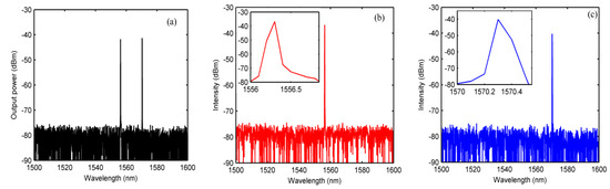 Test spectra of lasers in single-wavelength and dual-wavelength output states: (a) 1556-nm and 1570-nm output, (b) 1556-nm output, and (c) 1570-nm output.