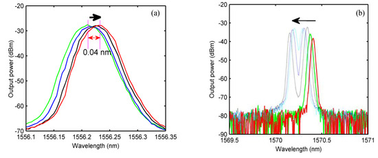 In order to further understand the regulation of the polarization state of the PC using the laser wavelength output characteristics, we observed the laser output state after slightly selecting the PC’s polarization control chip under the single-wavelength output state of the laser. The test results are shown in Figure 8. When the laser was operating in the short-wave (1556 nm) output state, as the PC’s polarization control chip was rotated slightly clockwise, the output laser’s center wavelength appeared red-shifted (as shown in Figure 8a). When the laser was operating in the long-wave (1570.3 nm) output state, as the PC’s polarization control chip was rotated counterclockwise, the output laser’s center wavelength appeared blue shift, and then gradually split into double peaks until the dual-wavelength output state was reached (Figure 8b).