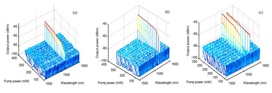 During the experiment, the output spectral power stability of the laser was also tested. The test results are shown in Figure 9. In the single-wavelength and dual-wavelength modes of operation, the laser output power increased with the pump power, and the output spectrum was stable. At different pump optical powers, the laser’s working center wavelength was stable without offset. The designed GOMC-based ring fiber laser could achieve stable, intensity-tunable, multi-wavelength-tunable laser output. This also indicated that the GOMC filtering characteristics were stable. The GOMC could accommodate the dual functions of the filter and the coupler in the laser cavity, which further simplified the laser system composition. Compared to other fiber laser systems, GOMC-based fiber lasers are simple, compact, low-cost, and easy to fabricate.