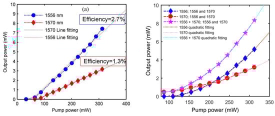 Figure 10 shows the output efficiency of the constructed fiber laser. When the laser was using a single-wavelength output, the laser output power increased linearly with the pump light. When the laser was operating at a short wavelength (1556 nm), the laser threshold was approximately 65 mW and the output efficiency was approximately 2.7%. When the laser was operating at a long wavelength (1570 nm), the laser threshold was about 87 mW and the output efficiency was about 1.3% (as shown in Figure 10a). The threshold of the laser’s dual-wavelength output was about 110 mW and the output power increased quadratically with the pump power. It can be seen that the short-wave output efficiency improved faster (as shown in Figure 10b). This indicated that the dual-wavelength output consumed a higher amount of pump light, but once the output was excited, the output efficiency increased rapidly with the pump power and was eventually as efficient as the single-wavelength output state. In addition, it can be seen from the test results that the laser cavity loss was still large. To meet practical applications, it is necessary to improve the output efficiency. The cavity loss of this laser was mainly determined by the insertion loss of the GOMC device (about 3 dB). In the sample preparation process, if the magazine residue on the graphene can be effectively removed and air pollution is avoided, a high-quality GOMC sample can be obtained. By optimizing the OMC parameter structure, the laser loss characteristics can be effectively improved.