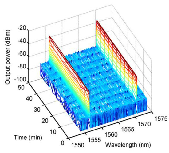 We also tested the stability of the laser’s dual-wavelength output state. During the experiment, the laboratory temperature (25 °C) and humidity (15%) were kept constant. When the pump power was 200 mW, the output state of the laser was monitored for 50 minutes. The test result is shown in Figure 11. The output power fluctuation of the 1556-nm center wave was less than 1 dBm, the output power fluctuation of the 1570-nm center wave was less than 0.8 dBm, and the two center wavelengths had no offset fluctuation. This power fluctuation was mainly due to the thermal noise of the laser system.