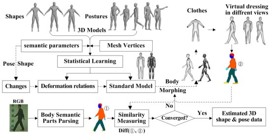 Referring to Equation (2), let denotes the parsed image from the 2D gait image and is the gait data of the parsed body part of 2D gait image, where is the index of pixels. Let , denotes the 2D gait image projected from the 3D model with virtual dressing onto the 2D space. By iterating the different 3D pose parameter and shape parameters , different 3D to 2D projected gait images are obtained and the corresponding parsed images are denoted by , where is the pixel value. Let denote the gait data of parsed body part of the body projected from a 3D gait model. Using the above data , , , and , the iterative process in Figure 2 is conducted by a least square optimization algorithm. A final refined semantically parsed 3D body data is determined and denoted by and .