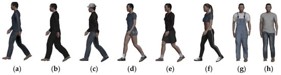 In gait recognition, clothes conditions change the gait silhouette shape and hide the inner features of the body shape. However, humans can quickly recognize the different clothing styles and estimate the body shape beneath the clothes. Thus, similar to the process, a FashionNet [] clothes recognition deep model is introduced to conduct the clothes recognition. FashionNet is based on a large-scale clothes dataset DeepFashion with 800 K clothing items with comprehensive annotations. It is trained to predict both clothing semantic attributes, i.e., colour, category, texture, etc. According to the basic category of clothes, the designed virtual clothes can be selected to dress the 3D body before shape deformation. Some basic clothing styles, i.e., T-shirt, regular pants, short pants, jeans, short shirt, blazer, etc. are shown in Figure 4, which are used to dress the different 3D gait models with different poses and body shapes. The clothes recognition method and virtual dressing [] make our 3D gait semantic data extraction accurate.