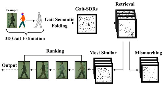 We note from the mathematical theory of sparsity, neurons, and active dendrites [], that SDRs can offer minimal probabilities of false positives. They are reliable mechanisms for classification. One main advantage of the Gait SDRs is that it allows data items to be calculated and compared directly. In the process of comparison and retrieval, as shown in Figure 6, the matching operator of SDRs can be directly calculated with semantic meaning using the logical operation, i.e., “AND” or “OR”, or a similar function.