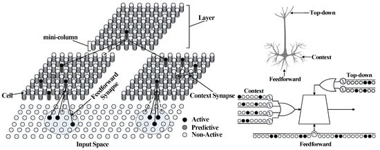 In this paper, the HTM model [] is introduced as the basis of a sequence memory model. HTM is based on the properties of cortical neurons, and mimics the structures and functions of the human neocortex (as illustrated in Figure 7).