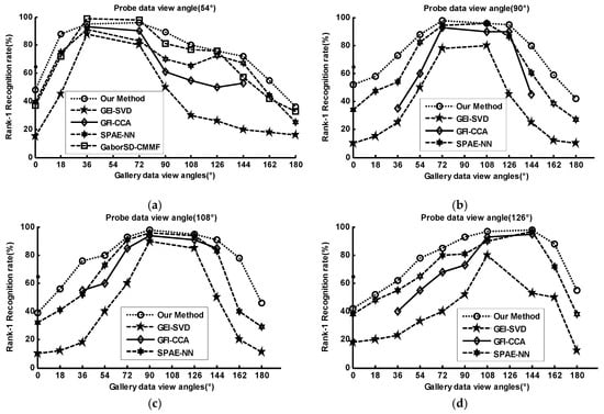 In order to evaluate the robustness of GRU-GSFSL under cross-views, we compare it with GEI-SVD [], GFI-CCA [], SPAE-NN [], and GaborSD-CMMF []. GEI-SVD and GFI-CCA uses the model-free gait feature representation methods for cross-view gait recognition. SPAE-NN introduces an invariant feature extraction method based on 2D GEI and uses one uniform deep model for cross-view gait recognition. GaborSD-CMMF extracts Gabor features from GEIs and uses coupled multi-linear marginal fisher criterion for feature encoding. Compared with the classic 2D gait descriptors, i.e., GEI and GFI, our method uses 3D-based gait SDRs descriptor for evaluation. Figure 10 shows the rank-1 recognition rates for views from 0° to 180°, where the recognition results of the four methods are extracted from their papers, and, for GaborSD-CMMF, only the cross-view recognition result under the 54° probe is reported. In Figure 10a, GaborSD-CMMF outperform the other methods when the views are close to probe view. Our BLGRU-BSFM also performs similarly to these views, but its performance is the best for other views.
