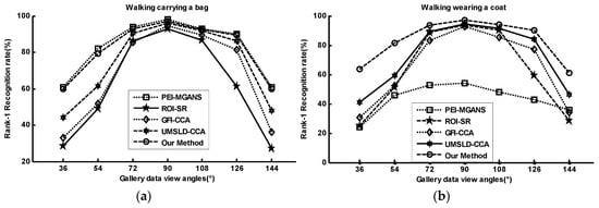 Figure 11 shows our method performs well compared with other methods, i.e., PEI-MGANS [], ROI-SR [], UMSLD-CCA [], and GFI-CCA [], especially under clothes conditions with large angle changes. Four related methods with the PEI-MGANS approach, reported their results under various walking variations in Reference [], i.e., carrying items and clothing changes, against cross-view walking conditions. Our comparison aims to evaluate the robustness of view-invariant gait recognition methods under the mixture of various walking conditions. In Figure 11a, PEI-MGANS achieves the best performance under bag carrying, but our method does well. However, the performance of PEI-MGANS is not good for changes of heavy clothes, as shown in Figure 11b. Our method is robust and less sensitive to various dressing conditions due to the clothing recognition network and virtual dressing process.