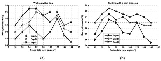 Additional experiments were conducted to show the advantages of our method. Figure 12 shows the rank-1 recognition rate of our method with attention model training on CASIA B gait dataset with multiple gallery views. In these experiments, experiment A denotes the model is trained with nine views from 18° to 162°. Experiment B with four views including 18°, 54°, 90°, 126°, and 162°. Experiment C has two views including 18° and 126°. Figure 12 clearly shows that, as more view refining knowledge is obtained, better performances are achieved by incorporating the information from more views. A larger number of training samples with various object carrying conditions and view angles contributed toward obtaining more memory and attention modulating items that led to more accurate sequence-level gait semantic images (SL-GSDRs) and better performance in arbitrary view gait recognition under various conditions.