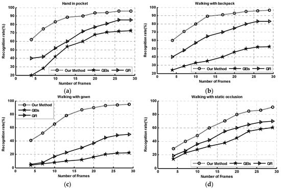 Figure 13 shows the rank-1 recognition rates of GRU-GSFSL, GEIs [], and GFI [] for walking normally on straight paths with a random number of probe frames. Unlike face classification, which can be achieved using only a single static image, gait recognition requires a cycle of frames to extract the periodic variation characteristics for good performances. It is especially important for model-free gait recognition methods like GEIs and GFI that are based on statistical information with various occlusions. However, it is sometimes difficult to obtain a full cycle of gait data due to occlusions or inadequate image resolution (caused by long-distance video capture). Our proposed gait recognition method based on gait semantic folding and a sequence learning network deals with the above issues, which uses the gait cycle as one of the covariate factors shown in Figure 8.