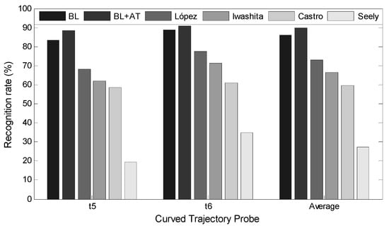 Two experimental conditions were arranged to evaluate the advantages of our method. First, the attention model not used for sequence-level gait SDRs refining and the unrefined gait SDRs were chosen for classification. We applied only the straight-path walking dataset for training and the curved trajectories were used as probe data for testing. We trained the attention model using a group of curved trajectories and conducted the experiment again for comparison. Figure 14 shows that our methods (BL and BL+AT) outperform the methods of López [], Iwashita [], Castro [], and Seely [] for curved gait trajectories. Due to the gait semantic feature representation, we transformed the 2D view-related gait raw images to the structured GSIs embedded with view-irrelated body shape data and rotation-invariant pose data. This process makes our gait representations in high-level space associated with special semantic meaning robust to the effects of the view factor. The top-down attention model plays an important role in refining the gait data free from curved trajectories by filtering the curve-related features. By using the attention model, our approach is robust for variations in view and in the path.