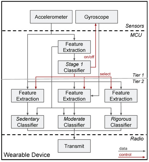 The proposed framework for on-board activity classification with wearable sensing systems. The framework is composed of an series of Random Forest classifiers that are structured hierarchically in two tiers. In the top tier (Tier 1), the Stage 1 classifier identifies the activity group (Sedentary, Moderate and Rigorous activity groups) and selects the corresponding Tier 2 classifier, which performs the activity classification. Only one of the Tier 2 classifiers and its corresponding feature extraction block is activated at a time depending on the output of the Stage 1 classifier. This approach allows us to keep the energy-hungry gyroscope powered-off, and activate it only when the user engages in activities whose classification can benefit from it. It is also noted that every feature extraction block extracts the features that are most informative for the respective classification task.