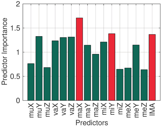 Focusing on the accelerometer-only case, we investigate the impact of reducing the number of features, with the goal to reduce the energy cost of feature extraction. The Random Forest classifier provides a means to rank the features, also known as predictors, in terms of their importance. For example, Figure 2 plots the predictor importance for Stage 1, and demonstrates that most information is contained in three features: the maximum value of the X axis, the IMA, and the minimum of the Y axis.