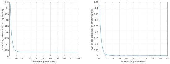 The effect of decreasing the number of trees on the accuracy of the Moderate classifier (left) and Rigorous classifier (right). 10 trees is a reasonable compromise between accuracy and feasibility for on-board implementation.