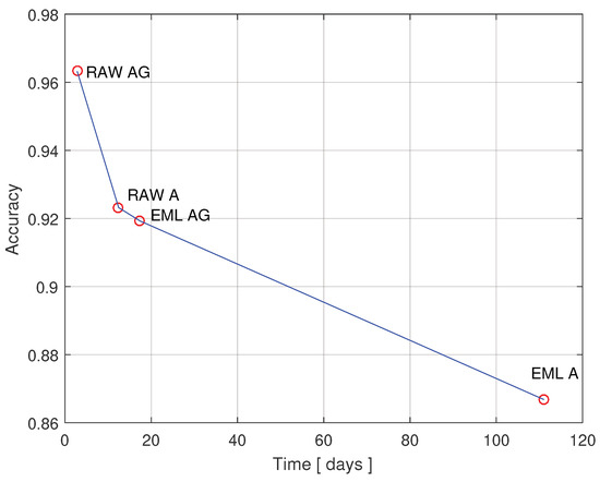 The trade-off between the model accuracy and lifetime. Legend: Raw Data—Accelerometer Only (RAW A); Raw Data—Accelerometer and Gyroscope (RAW AG); On-Board Classification—Accelerometer Only (EML A); On-Board Classification—Accelerometer and Gyroscope (EML AG).