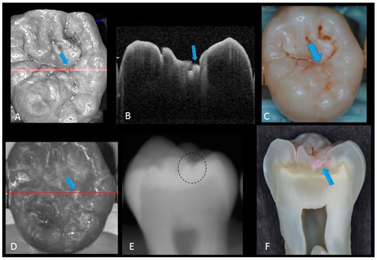 - Shimada, Y.; Sadr, A.; Burrow, M.F.; Tagami, J.; Ozawa, N.; Sumi, Y. Validation of swept-source optical coherence tomography (SS-OCT) for the diagnosis of occlusal caries. J. Dent. 2010, 38, 655–665. [Google Scholar] [CrossRef]