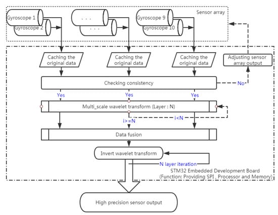 An important method for improving sensor output accuracy is to use multisensor data fusion technology. A MEMS array [2] measures the angular velocity of a given carrier with multiple MEMS gyroscopes and, then, uses data fusion to obtain the optimal estimate. This technique is also referred to as ”virtual gyroscope” technology, and it was first proposed by the Jet Propulsion Laboratory (JPL) in the United States. In 2003, the JPL personnel simulated four gyroscopes with drifts of 8.66°/h. Under static conditions, when the correlation coefficient between gyros is −0.333, the drift of the gyro is reduced to 0.062°/h [3]. Xue Liang et al. [4] studied the correlation of a MEMS array and demonstrated its influence on the angular velocity accuracy signal. Previous studies [5,6] presented a design method and a fusion estimation method using MEMS arrays under different scenarios. Moschas Fanis et al. [7] proposed a simple and effective method for testing the performance of state-of-the-art MEMS arrays in various engineering applications. In addition, with the continuous development of wavelet technology [8], the superior performance of wavelets in filtering has led to extensive applications in the field of signal processing.