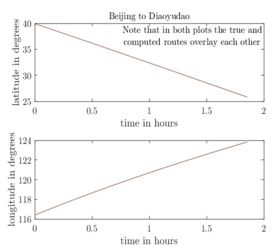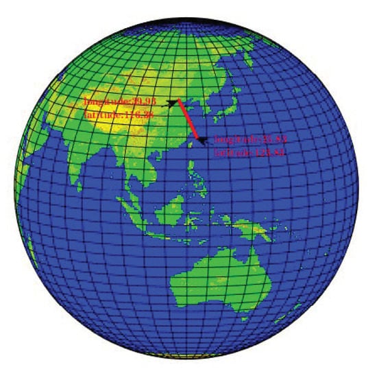 A great circle path with a maximum height of 10 km was simulated, starting from a point in Beijing (longitude 39.93, latitude 116.38) and ending at a small island (longitude 25.83, latitude 123.83). The distance as the crow flies is approximately 1730 km, and the flight path of the aircraft is a great circle, with a maximum altitude of 10 km and a maximum flight speed of 500 nautical miles per hour. The trajectory top view is shown in Figure 2.