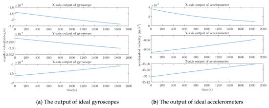 According to the trajectory, the flight path of the aircraft is simulated, and the coordinate changes in the flight path and the ideal sensor output are calculated in real time. The coordinate variation is shown in Figure 3, and the ideal sensor output is shown in Figure 4.