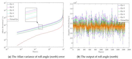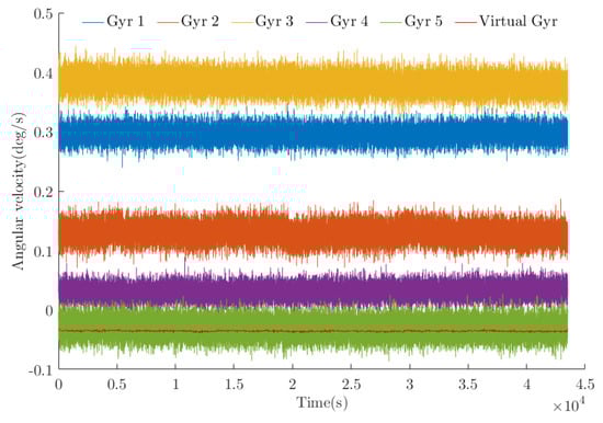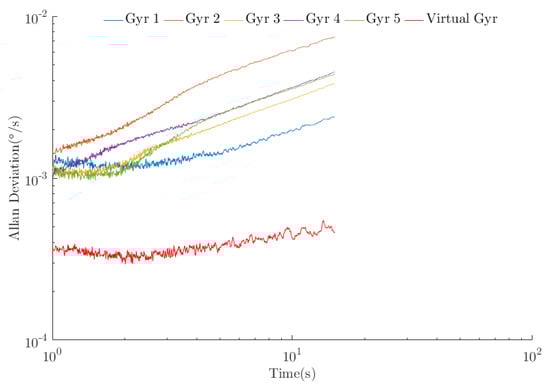 To observe the difference between the processed data and the original data more intuitively, five gyroscope data points in the sensor array were selected for visualization. A schematic diagram of the original signal and the optimal estimated value after the algorithm processing is shown in Figure 10. The angle random walk noise (ARW), zero-bias instability noise (BI), and rate ramp noise (RR) are important parameters for measuring gyroscope performance [22]. The Allan variance method [23,24] is currently the most effective method for calibrating the error of MEMS gyroscopes. In the experiment, the regression analysis method [25] was adopted to perform the Allan variance analysis for the original signal and the optimal estimated value. The bilogarithmic diagram is shown in Figure 11. The result produced by the WCF algorithm is the curve corresponding to the “virtual gyroscope”. A comparison to the original data shows that the trends of the curves are basically the same, indicating that data processing does not change the error characteristics of XV7011BB. The magnitude of the error was greatly reduced relative to the error amplitude of the original data, indicating that the various errors of the gyroscope were significantly weakened and that the degree of error improvement was basically the same and relatively balanced.
