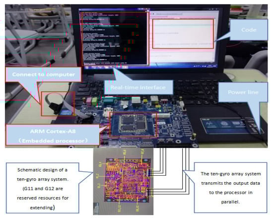 According to the literature [20,21], there are two design methods for MEMS gyro arrays. The first one manufactures several MEMS gyroscopes on the same chip, which is beyond the scope of this paper. The second one, which is used in this paper, fabricates several MEMS gyroscopes on a printed circuit board (PCB). A ten-gyro array system for collecting data was designed. Ten MEMS gyro sensors of the same batch and same model (XV7011BB) were selected for the experiment. The system was fixed on an experimental platform for experimental testing. The MEMS gyroscope has a data output frequency of 200 Hz.