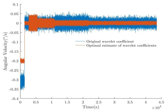 The measured data were processed according to the algorithm. First, we still used db3 as the wavelet basis. Second, the FIFO (first input, first output) stack was set to 1000. Every second, 20 data points were added to the stack, and then the data in the stack were processed. Obviously, this system is a memory system. Depending on the type of gyroscope, we can adjust the depth of the stack to satisfy its real-time requirements.