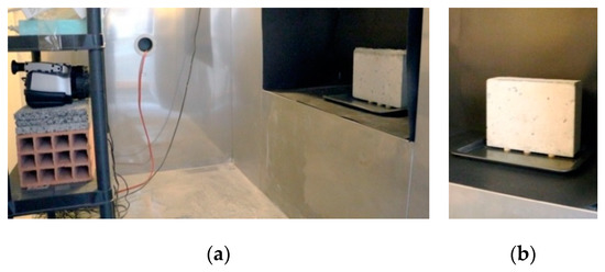 A lightweight concrete specimen was used as a case study. Table 1 shows the main characteristics of the material under study [34]. The test was performed inside a climatic chamber under stable conditions (20 ± 0.5 °C and 60% ± 2%). The specimen was partially humidified by the bottom surface, after being previously dried in an oven at 110 ± 5 °C until mass stabilization was reached (mass variation of 0.1% of the total mass of the specimen, when measured over 24 h). The humidification occurred by placing the specimen for 24 hours inside a tank filled with tap water to a level of 5 ± 2 mm above the base of the specimen. This level was maintained during the entire humidification period (Figure 1).