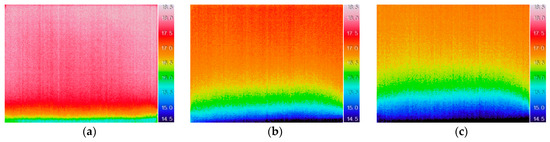 Thermal images of the entire specimen: (a) t = 0 h (immediately after the beginning of humidification); (b) t = 4 h; (c) t = 24 h.
