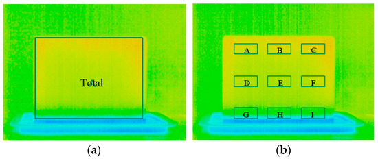Three different techniques were used to qualitatively evaluate the results: (A) descriptive statistics (statistical measures, histograms, and box plots); (B) image subtraction, which was used to highlight the surface temperature variations between measurement periods; (C) thermal index, traducing the variation rate of the surface temperature. To implement these techniques, two different methodologies were applied: (i) one box limiting the entire specimen (189 × 143 pixels) was selected on the thermal image (Figure 3a); (ii) nine identical boxes were defined on the images, three at the top of the specimen (boxes A, B, C in Figure 3b), three in the middle (boxes D, E, F in Figure 3b), and three at the bottom (boxes G, H, I in Figure 3b). All nine boxes were defined with 42 × 19 pixels.