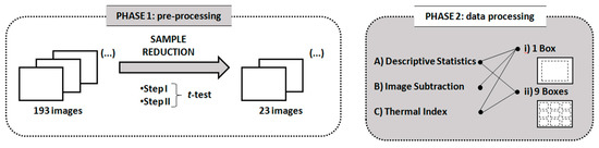 In the first step of the sample reduction, the statistic t-test was applied to compare sample means of the 193 thermal images. The average temperature of every two consecutive thermal images of the time sequence was compared to understand if they were statistically different. In the first attempt, a significance level of 5% was considered, but it proved to be a particularly demanding criterion as the results revealed that all images were statistically different. For that reason, a new criterion was implemented, establishing a t-value higher than 20 as the rejection limit. This procedure resulted in a 70% reduction, corresponding to 58 thermal images remaining.
