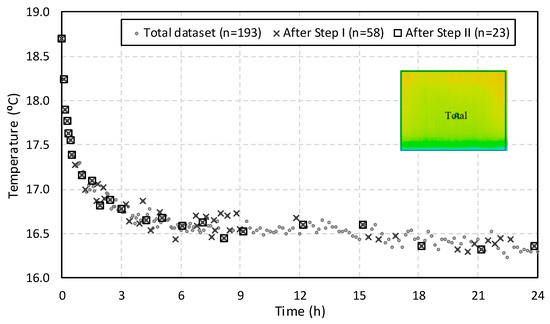 Figure 6 illustrates the average temperature of the entire specimen (Figure 3a) before (total dataset) and after carrying out the two phases (after Step I and after Step II) of the reduction procedure. During the first hour, most of the thermal images were maintained after the pre-processing phase, because the changes on the surface temperature occurred rapidly, resulting in significant differences even between consecutive images. After Step I, a reduction of 31% was accomplished, increasing up to 38% after Step II. The temperature differences occurred due to a combined effect of water evaporation at the surface as a result of the humidification phenomenon and thermal adjustment to the environment. The analysis presented in the sections below proves the importance of the latter.