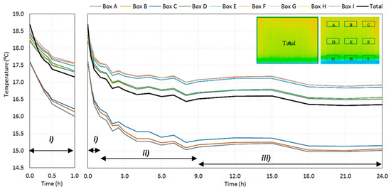 Box-plot representation of the surface temperatures of the entire specimen: (i) first hour, when the temperature drop was sharp; (ii) between 1 and 9 h, when the temperature kept decreasing, although at a much slower rate; (iii) after 9 h, when the temperature remained almost constant until the end of the test.
