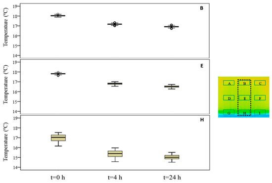 Box-plot representation of the surface temperatures of boxes B, E, and H.