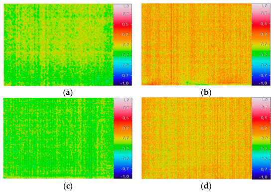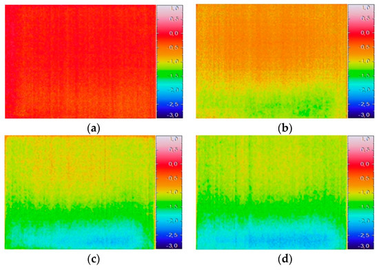Figure 10 shows the results of the first procedure applied to four different moments: t = 0.5 h, t = 2.5 h, t = 9 h, and t = 24 h. In the first moment, after 30 min, although not obvious, the cooling effect was already observable in the bottom of the specimen (yellow pixels in Figure 10a). As the experiment proceeded, this effect was enhanced, especially at the bottom of the specimen. In fact, the temperature differences at the top of the specimen remained very similar, which indicates that moisture did not reach that level. At the bottom, temperature differences varied from approximately −1 °C in the first 30 min of humidification to −3 °C at the end of the measurement. However, the values tended to stabilize after the ninth hour, as no very relevant changes could be observed when comparing Figure 10c and Figure 10d.