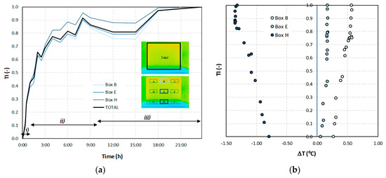 The thermal index, TI, ranges between 0 and 1 and quantifies the cooling rate of the specimen. Figure 12a depicts the time-evolution of the index. In each thermal image, the index was calculated for the entire specimen and separately for each box. However, only the results of boxes B, E, and H are included in the figure to facilitate its interpretation, as these three boxes were representative of each level. The three phases already identified in the previous analysis were also visible in this representation. After the first hour, approximately 40% of the total cooling process already occurred. The overlapped lines of the graph confirmed that this temperature decrease was mostly due to the overall cooling of the specimen. Only after the first three hours was the effect of moisture on the surface temperature of the specimen clearly marked, as the value of index TI calculated for box H deviated from that obtained for the other two boxes, where the presence of water was lower and the cooling effect due to evaporation was less intense.