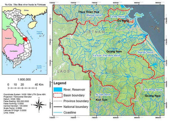 Geographic location of the Vu Gia-Thu Bon (VGTB) river basin [21] (reproduced with permission from Nguyen Kim Loi, Nguyen Duy Liem, Le Hoang Tu, Nguyen Thi Hong, Cao Duy Truong, Vo Ngoc Quynh Tram, Tran Thong Nhat, Tran Ngoc Anh, and Jaehak Jeong, Journal of Water and Climate Change; published by IWA Publishing, 2019).