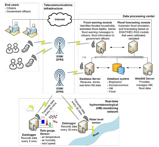 Vu Gia-Thu Bon (VGTB) river basin is an area where flash flood and heavy flood events occur frequently, negatively impacting the local community and socio-economic development of Quang Nam Province. In recent years, structural and non–structural solutions have been implemented to mitigate damages due to floods. However, under the impact of climate change, natural disasters continue to happen unpredictably day by day. It is, therefore, necessary to develop a spatial decision support system for real-time flood warnings in the VGTB river basin, which will support in ensuring the area’s socio-economic development. The main purpose of this study is to develop an online flood warning system in real-time based on Internet-of-Things (IoT) technologies, GIS, telecommunications, and modeling (Soil and Water Assessment Tool (SWAT) and Hydrologic Engineering Center’s River Analysis System (HEC–RAS)) in order to support the local community in the vulnerable downstream areas in the event of heavy rainfall upstream. The structure of the designed system consists of these following components: (1) real-time hydro-meteorological monitoring network, (2) IoT communication infrastructure (Global System for Mobile Communications (GSM), General Packet Radio Service (GPRS), wireless networks), (3) database management system (bio-physical, socio-economic, hydro-meteorological, and inundation), (4) simulating and predicting model (SWAT, HEC–RAS), (5) automated simulating and predicting module, (6) flood warning module via short message service (SMS), (7) WebGIS, application for providing and managing hydro-meteorological and inundation data, and (8) users (citizens and government officers). The entire operating processes of the flood warning system (i.e., hydro-meteorological data collecting, transferring, updating, processing, running SWAT and HEC–RAS, visualizing) are automated. A complete flood warning system for the VGTB river basin has been developed as an outcome of this study, which enables the prediction of flood events 5 h in advance and with high accuracy of 80%.