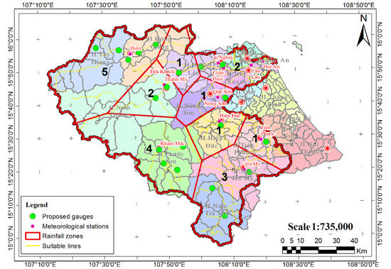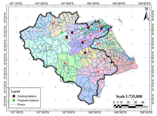 More importantly, our analysis using Thiessen’s interpolation method has also shown that the VGTB river basin has 9 different rainfall zones. Thus, based on the weight of rainfall zone areas, the number of stations should be different for each rainfall zone. Specifically, the additional numbers of stations for nine zones of large rainfall areas in the VGTB river basin were set as 1, 5, 1, 1, 3, 2, 4, 1, and 2 for Ai Nghia, Hien, Hiep Duc, Hoi Khach, Kham Duc, Nong Son, Tien Phuoc, Thanh My, and Tra My, respectively. Next, embedded maps on GIS environments such as hydrography, wind directions, transportation, and sub-basin were exploited to determine appropriate locations for the required stations. As a result, the optimum numbers and locations of meteorological stations have been achieved in our study, with suitable places to set up our station for each range of rainfall areas, as shown in Figure 3 [22].