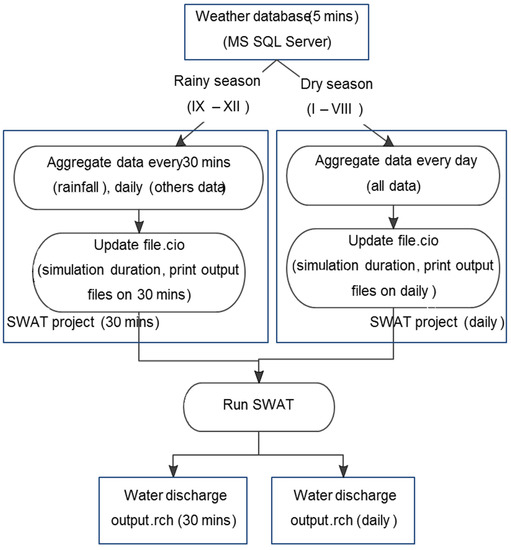 The automated procedure for streamflow simulation in SWAT consists of three steps, differentiated by season (rainy or wet season, see Figure 5): (1) real-time weather data (recorded every 5 min) and stored at the MS SQL Server database management system is aggregated into weather input files, in accordance with a predetermined interval of 30 min (for rainy season) or daily (for dry season); (2) simulation duration is updated such that the last date of weather data updates and the end day of simulation should match; then, the frequency of output files is printed in the master River Basin file every 30 min or daily; and (3) the SWAT model is run to simulate streamflow stored in the main channel output file.