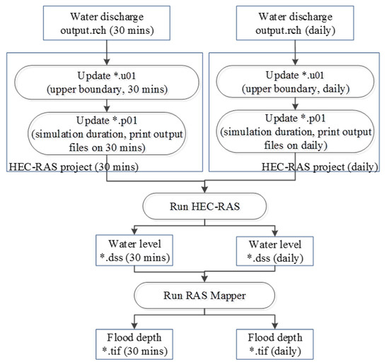 Figure 6 illustrates the automated procedure that was used in the simulation of water level and flood depth (in the rainy or dry season) based on the HEC–RAS model, in four steps as follows: (1) by using water discharge data extracted from the SWAT model’s main channel output file, the boundary and initial conditions of cross sections in the unsteady flow data will be updated; (2) simulation duration will be updated such that the end day of simulation and the last date water discharge data has been updated should match, then the frequency of output files will be printed plan file; these will be implemented every 30 min (rainy season) or daily (dry season); (3) HEC–RAS model is run to simulate water level stored in DSS format; (4) RAS Mapper will be run to map flood depth stored in GeoTiff format. The file name matches the inundation time.