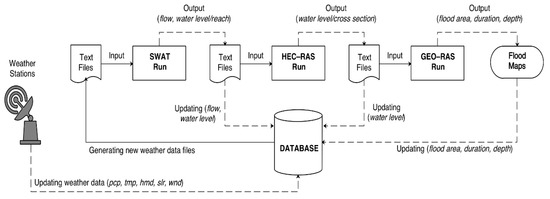 SWAT and HEC–RAS models have been extensively adopted in real-time flood modeling and forecasting. Rainfall distribution algorithms were proposed to project precipitation using data from auto weather stations and rainfall/runoff hydrological models in SWAT [10]. The HEC–RAS model was applied to design a near real-time flood monitoring system for the Marikina river basin, Philippines [11], or incorporated with Shuffled Complex Evolution to represent a real-time updating procedure for streamflow forecasting in the Lower Iguazu basin, Brazil [12]. For customizing HEC–RAS, Leon and Goodell [13] developed scripts in MATLAB to automate writing and reading input/output files, make plots, implementing parallel computations of the processes in their model. A real-time flood forecasting and flood inundation mapping for the Bagmati river system of Bihar, India was designed that integrated the SWAT and HEC–RAS models [14].