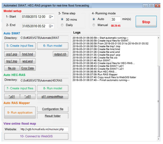 The application’s interface is organized as follows: Firstly, the model is set up by declaring start time, end time, time step (30 min/daily), and running mode (automatic/manual). By default, the start time is date 2015/09/01 (time when automatic meteorological stations transmit data fully, validly), end time is assigned to the system’s current time. Secondly, the start/stop is turned on and automatic running mode is turned on/off. Thirdly, auto SWAT is activated by creating input files, running model, linking to input files (pcp1.pcp, tmp1.tmp, hmd.hmd, wnd.wnd, file.cio), errors report of input data (Error Data), and link to output file (output.rch). Then input files, run model, link to input files (*.p01, *.u05), and results report of running model (p01.computeMsgs) are created using the auto HEC–RAS. Next, we use the auto RAS Mapper to run the application, link to configuration file “Mouse Tracking”, result folder. After that, it is necessary to view the online flood map by using “Connect to WebGIS” function to view the flood depth map. Lastly, logs display timeline for step-by-step implementation and start/finish status of the whole process.