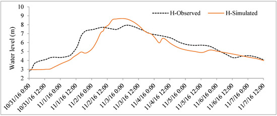 The validation water level at the Cau Lau hydrological station in the VGTB river basin during October 31–November 7, 2016 flood event.